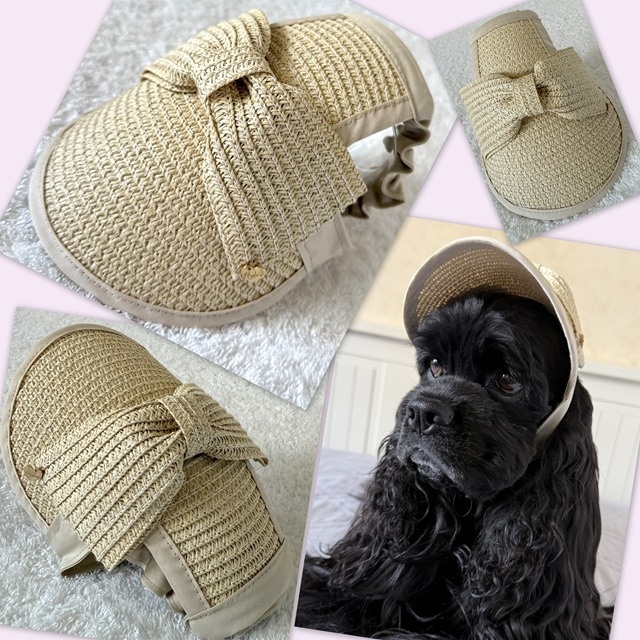 コッカーが刺繍された大きなリボンがアクセントの麦わら帽子です 夏の暑い日差しや紫外線から目を守ってあげてください 気分は・・・ Feeling Good(*´ω`*) サイズ 顔周り(耳下から耳下まで)・・・約32cm+アジャスター(ゴム) 首周り約40cmのベルトにゴムを入れています 頭部・・・約8cm ★配送はつぶしてのお届けになりますので到着しましたら 形を整えていただいてご着用ください